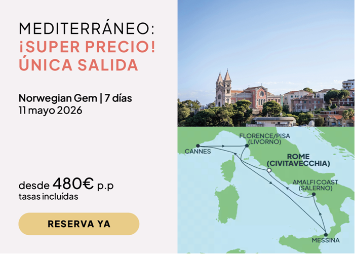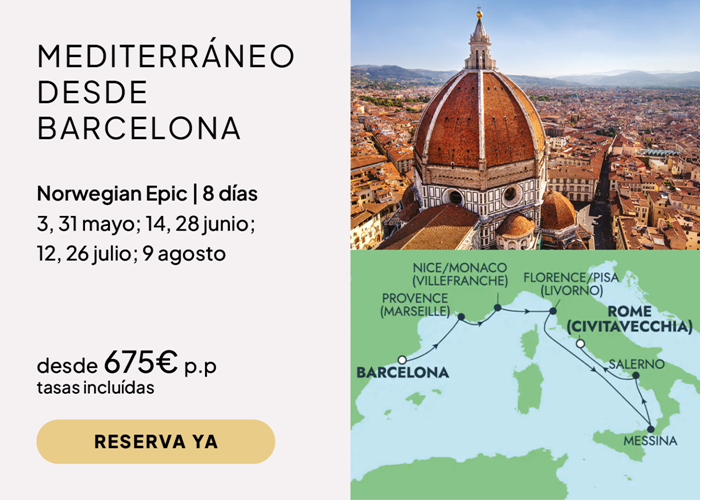 8 Días de Crucero Barcelona · Navegación · Salerno · Amalfi · navegación (Estrecho de Messina) · Messina (Sicilia) · Corfú · Kotor · Navegación · Trieste.