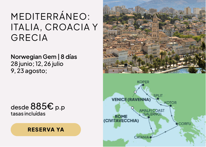 15 días de Crucero -Barcelona · Navegación · Salerno · Amalfi · navegación (Estrecho de Messina) · Messina (Sicilia) · Corfú · Kotor · Navegación · Trieste · Zadar · Dubrovnik · Navegación · La Valletta · Navegación · Nápoles · Civitavecchia (Roma)
